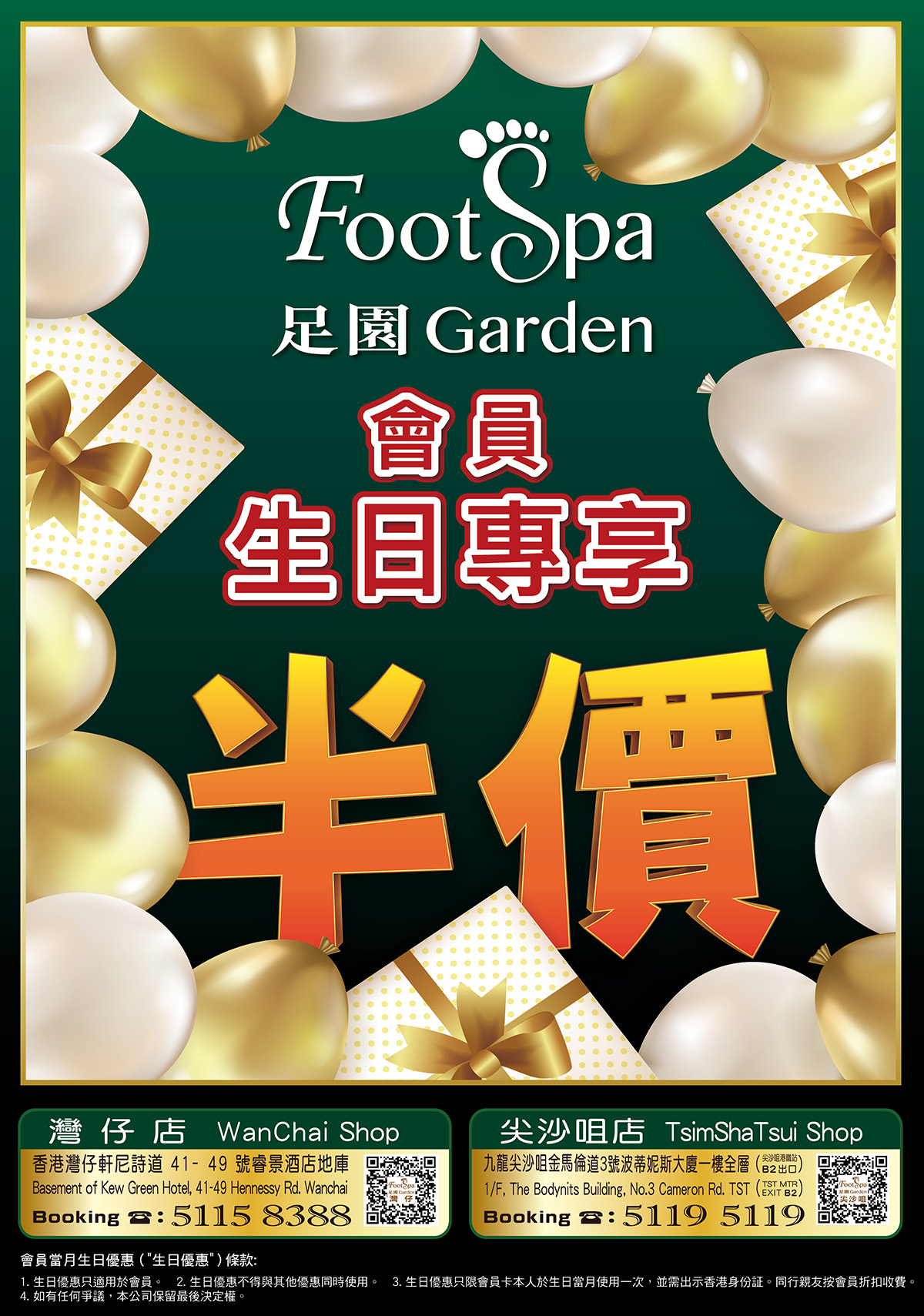 | Established in 2013 and located at the heart of the city (Wan Chai and Tsim Sha Tsui), FootSpa Garden is proud to serve the community as an oasis amid the busy and stressful city life of Hong Kong. We feature a comfortable environment with relaxing atmosphere and provide professional massage services to refresh your body and spirit. Our services include Reflexology foot massage with foot bath, body massage (traditional pressure point, Aromatherapy or Lymphatic body massage), shoulder and back massage and Pedicure (Shanghai style). With lots of private rooms for body massages, we are sure that you can enjoy a refreshing massage experience in a quiet and relaxing atmosphere. | |